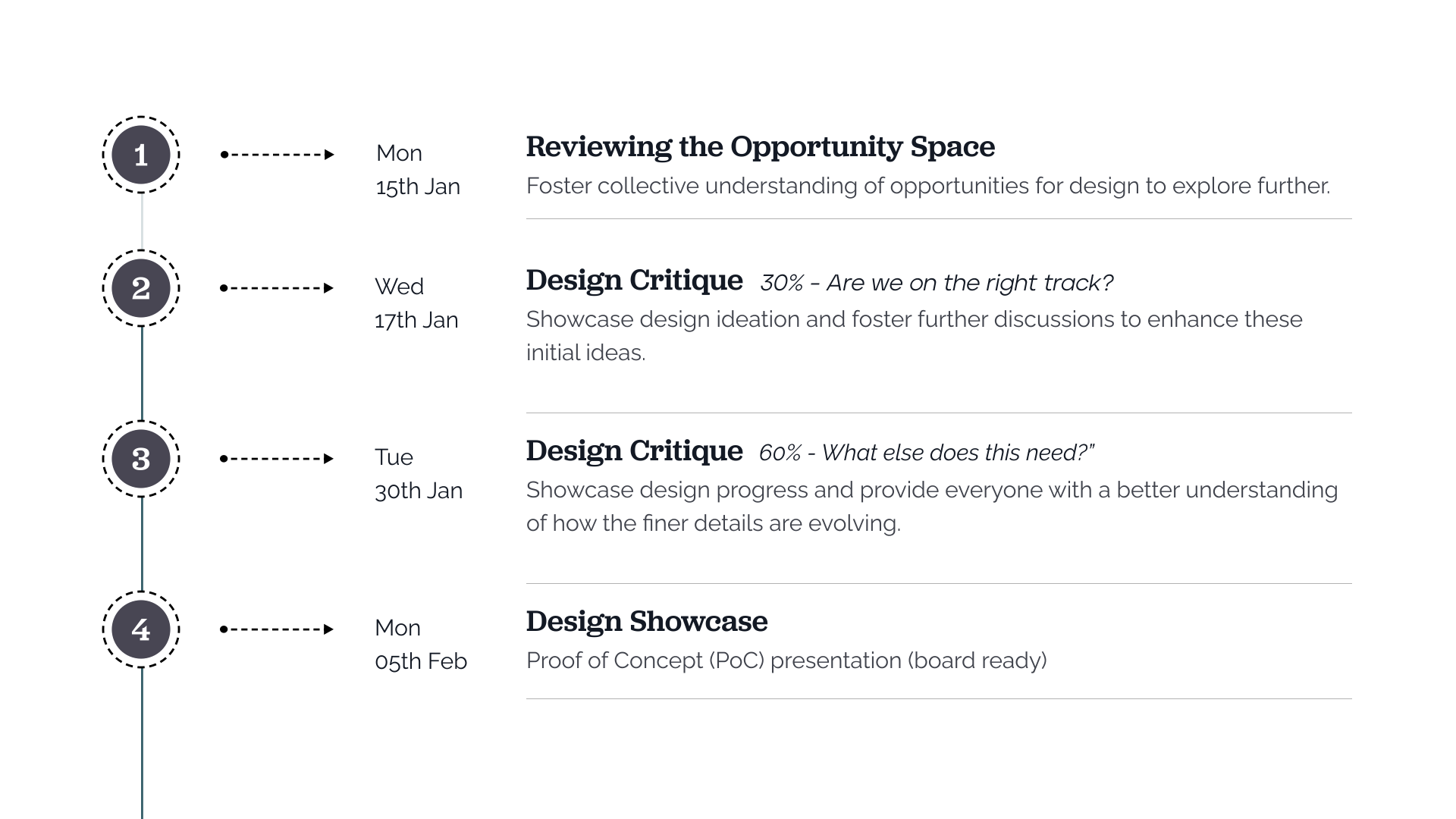 The project followed a structured three-week design sprint, marked by the following four key milestones: